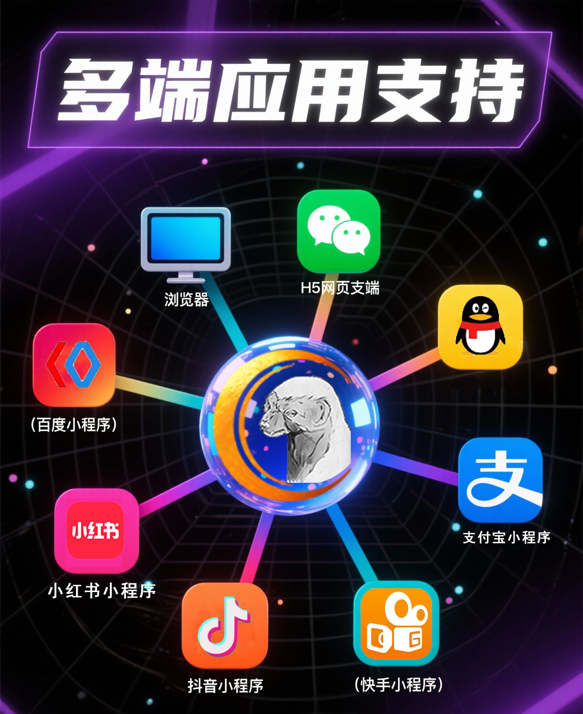 平台支持 Pc电脑端,H5网页端,微信小程序,百度小程序,支付宝小程序,抖音小程序,快手小程序,小红书小程序,公众号对接等九项生态的拓展。